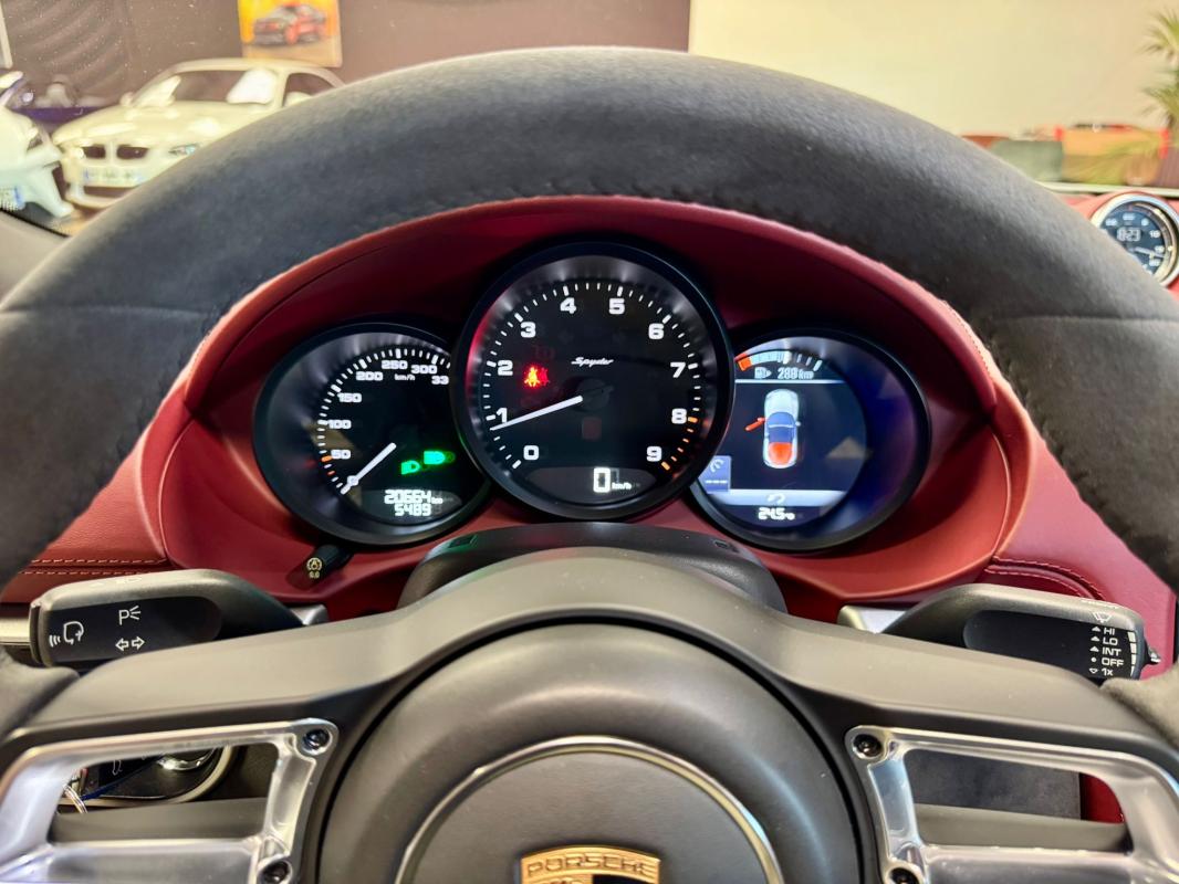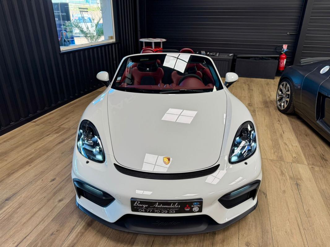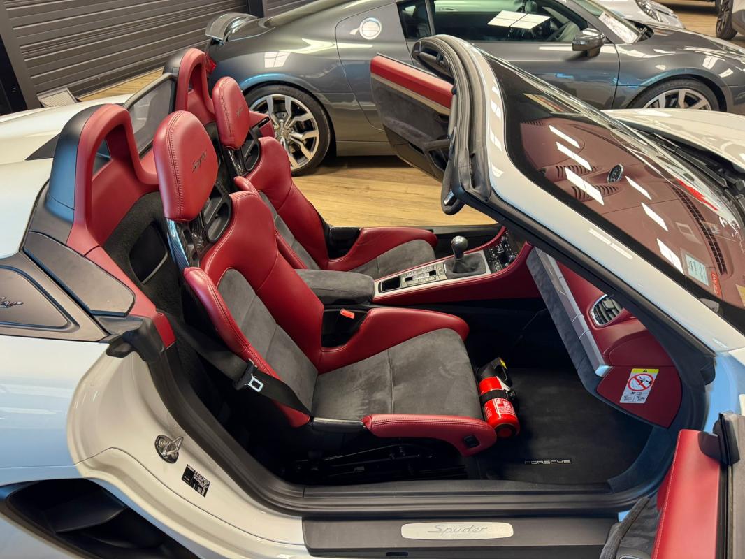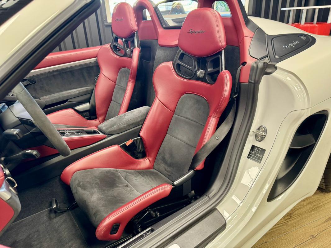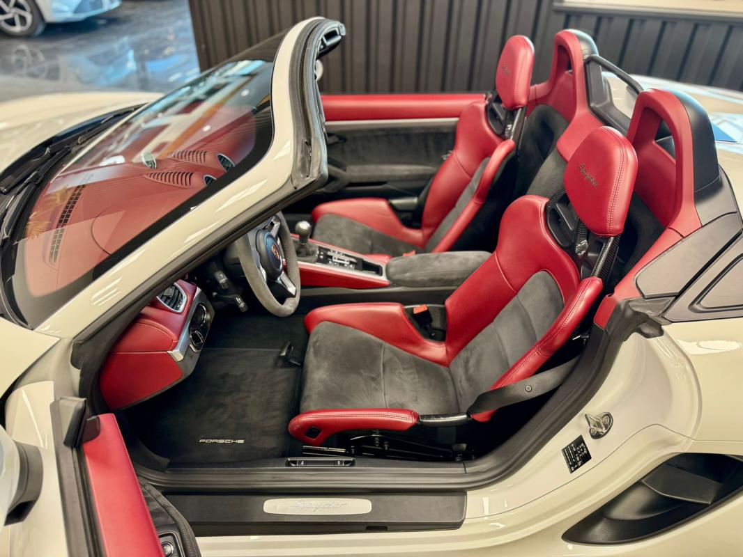 Disponible à notre adresse : Pont Maréchal, 42120 Saint-Vincent-de-Boisset 112900 € (982) SPYDER 4.0 420 Bvm6, essence, blanc verni, 04/09/2019, capote bordeaux, capote manuelle, PDLS + sur fond noirs, covering Xpel intégral, Jantes noires 20, logo Porsche coloré sur les moyeux de roues centraux, cuir étendu sur le tableau de bord, sièges 918 Carbone, étriers de freins rouges, aileron réglable, PASM, PSE, pack sport chrono, échappement noir sport à valves, feux arrières teintés, intérieur cuir alcantara, carnet 100% Porsche à jour, Véhicule non accidenté, état proche du neuf, éligible au Porsche Approved, garantie de 12 à 60 mois constructeurInformation