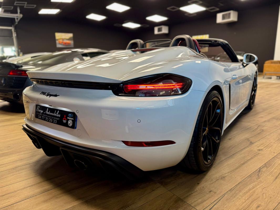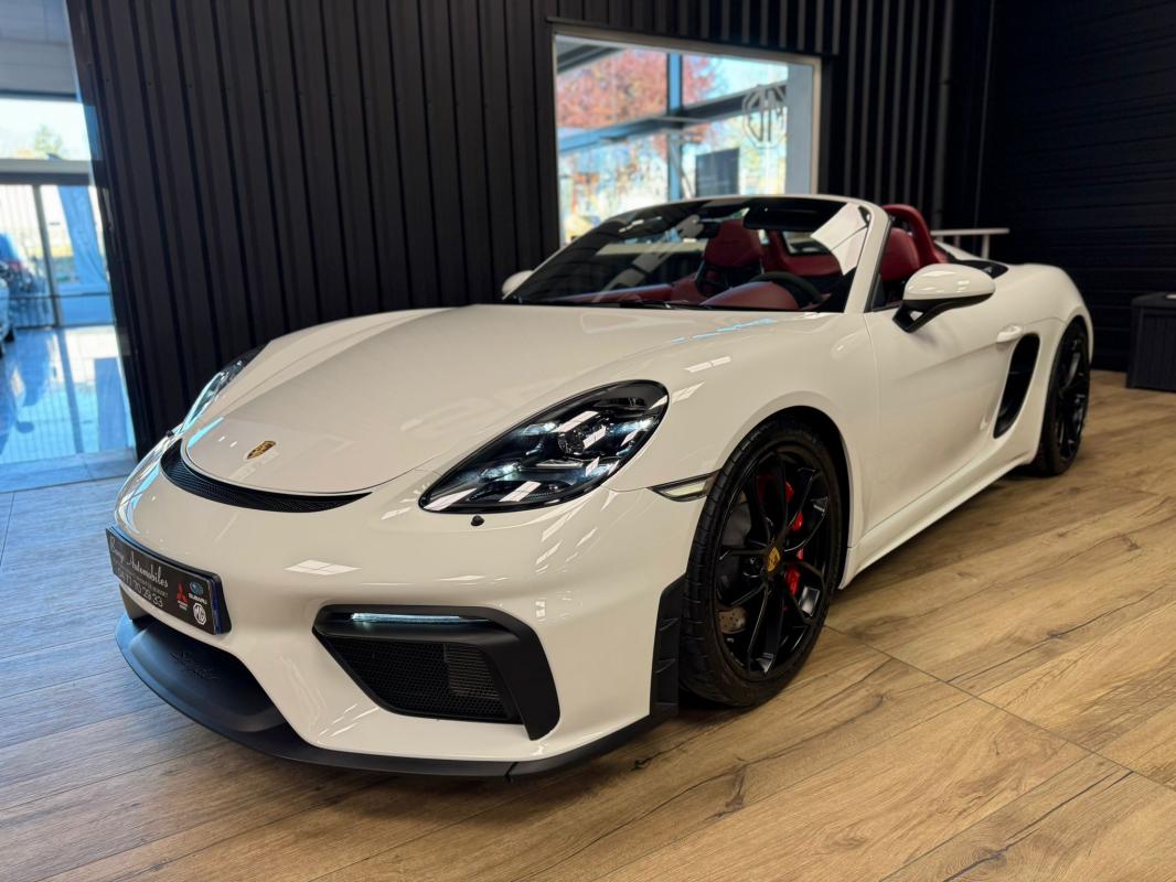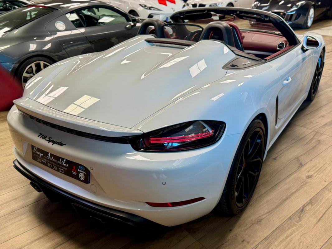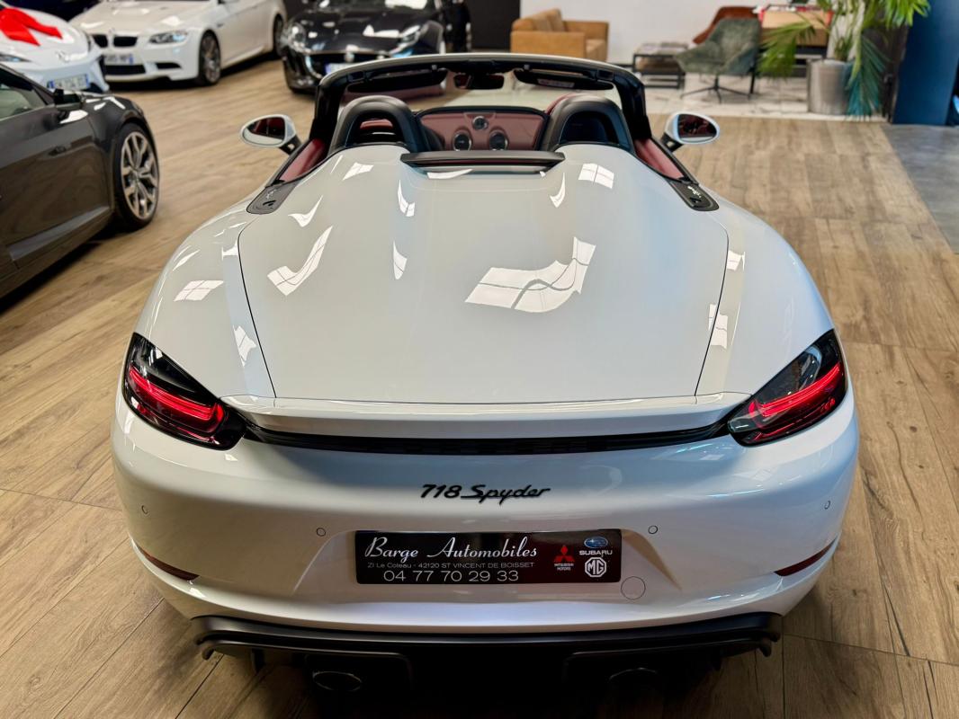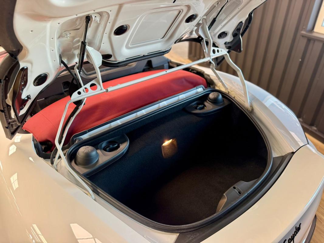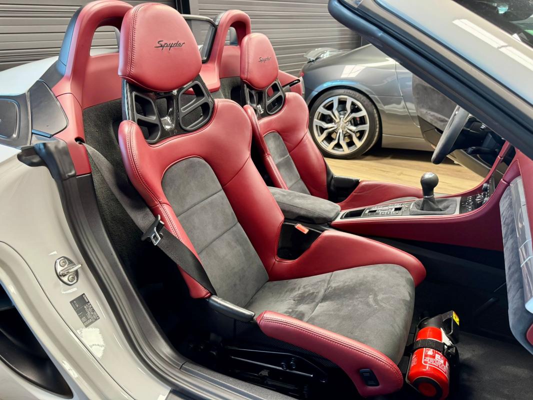 Disponible à notre adresse : Pont Maréchal, 42120 Saint-Vincent-de-Boisset 112900 € (982) SPYDER 4.0 420 Bvm6, essence, blanc verni, 04/09/2019, capote bordeaux, capote manuelle, PDLS + sur fond noirs, covering Xpel intégral, Jantes noires 20, logo Porsche coloré sur les moyeux de roues centraux, cuir étendu sur le tableau de bord, sièges 918 Carbone, étriers de freins rouges, aileron réglable, PASM, PSE, pack sport chrono, échappement noir sport à valves, feux arrières teintés, intérieur cuir alcantara, carnet 100% Porsche à jour, Véhicule non accidenté, état proche du neuf, éligible au Porsche Approved, garantie de 12 à 60 mois constructeurInformation