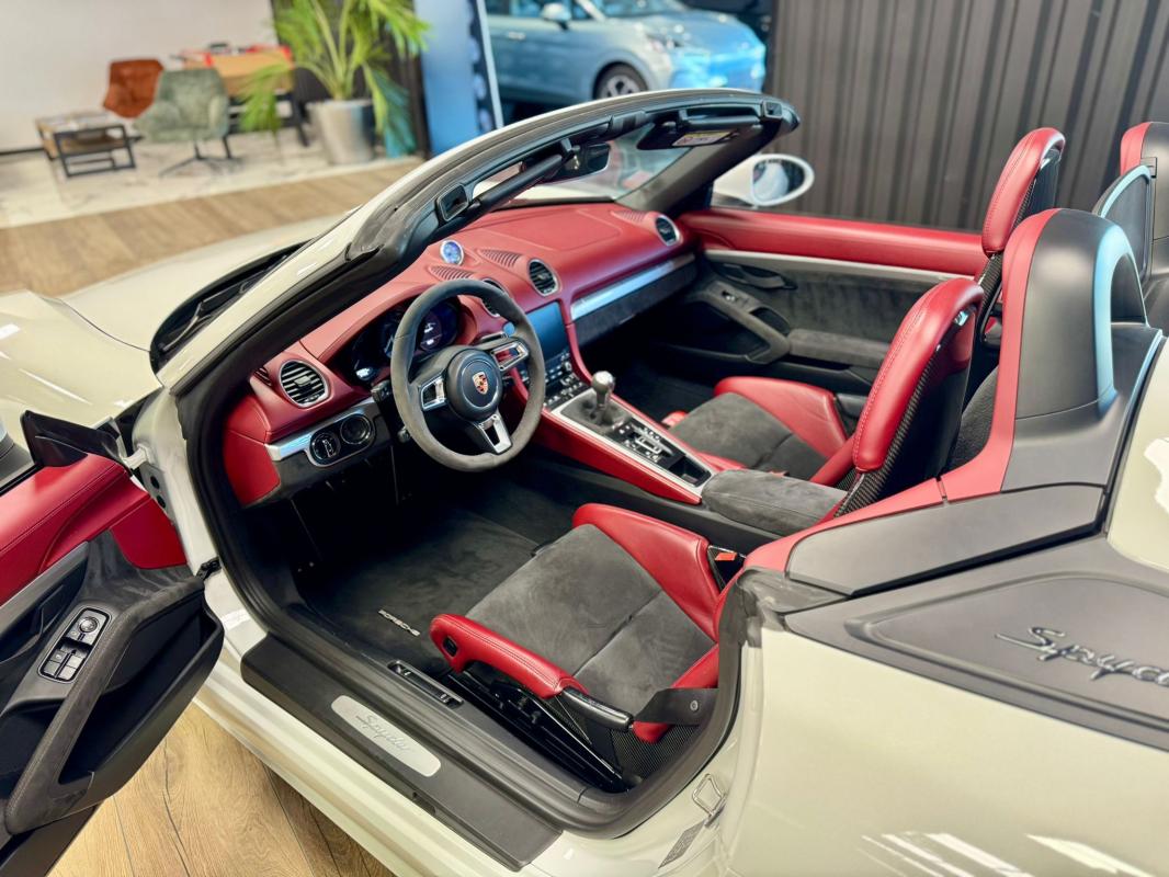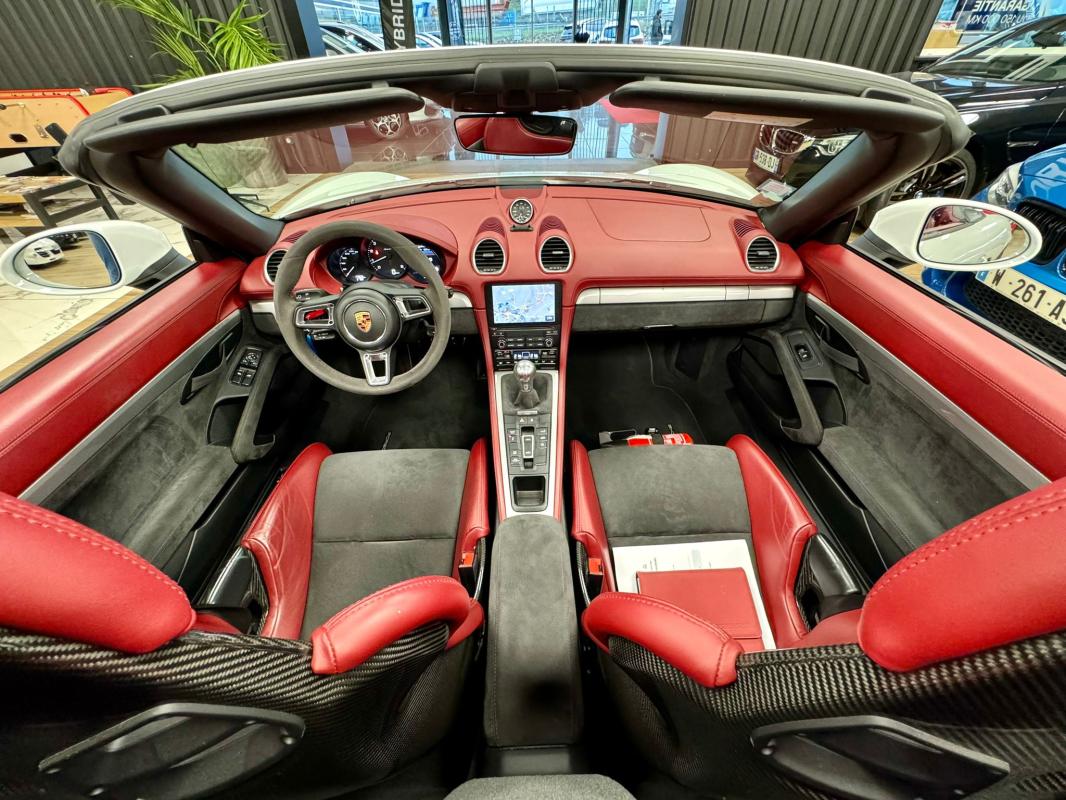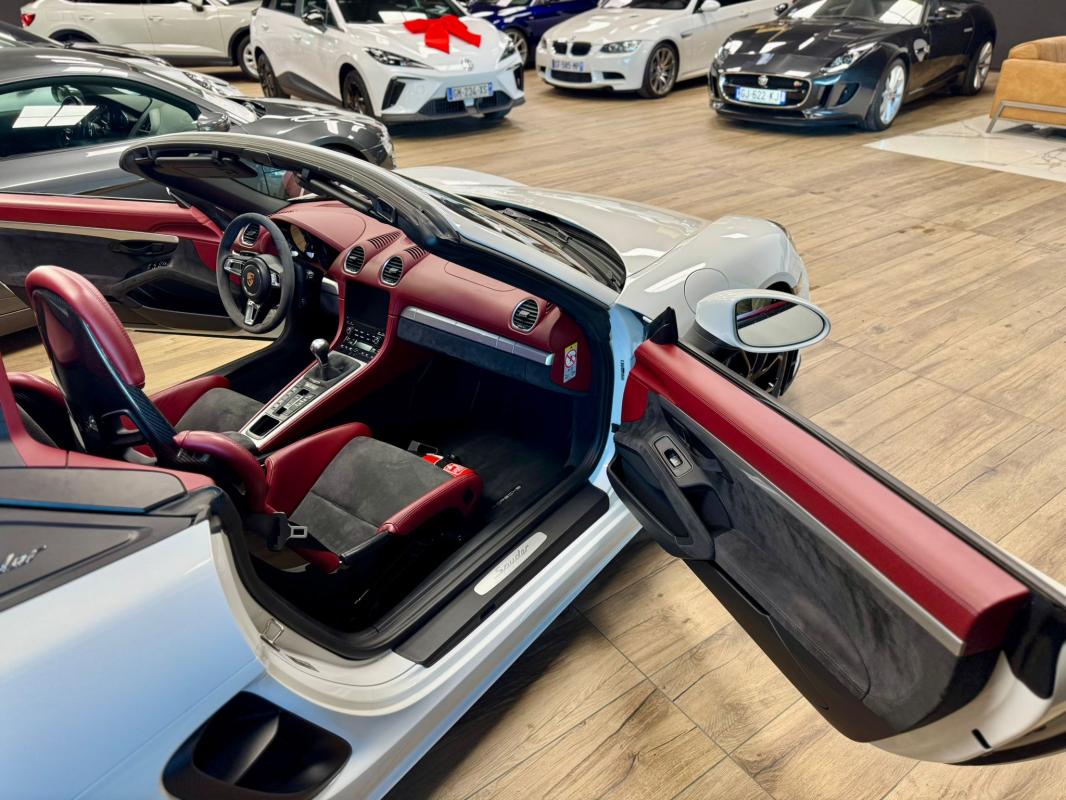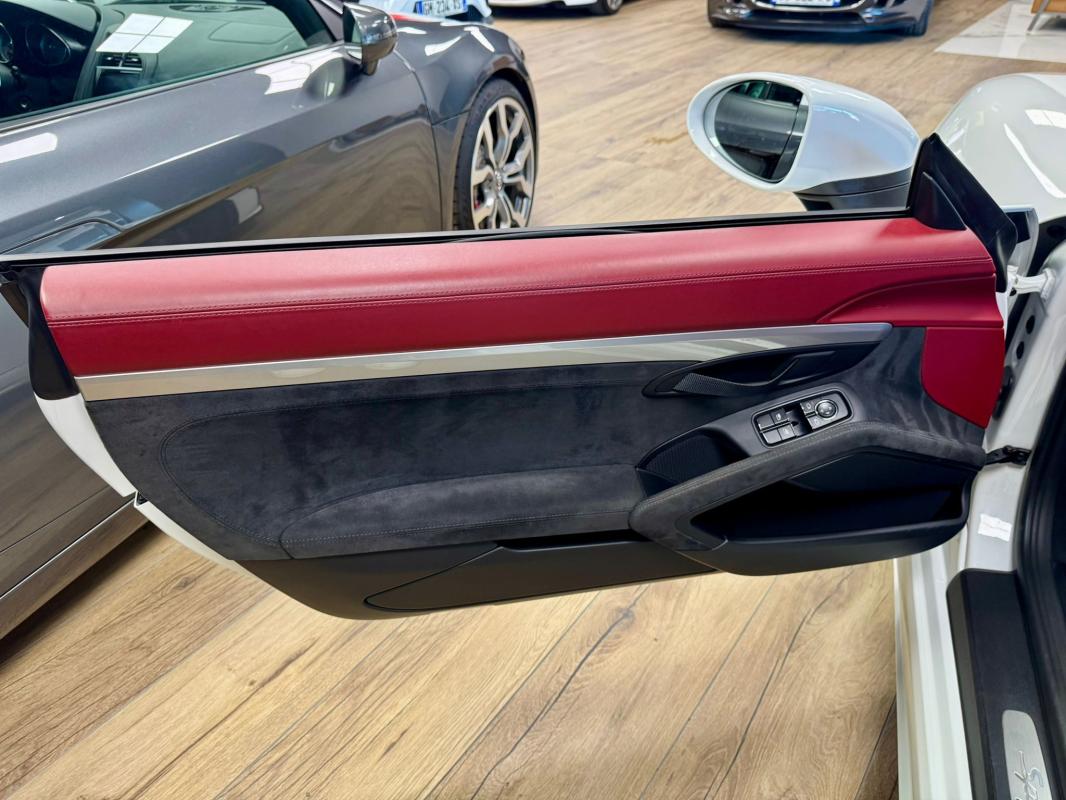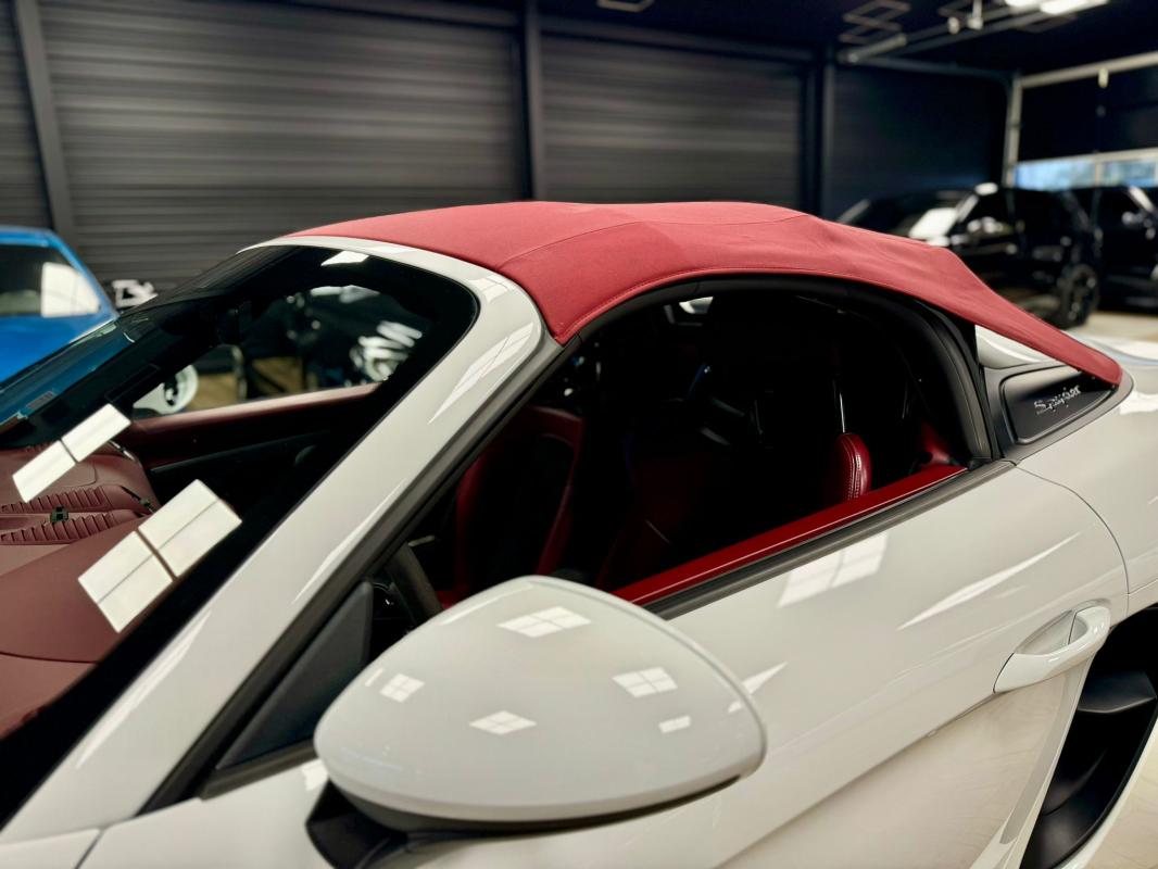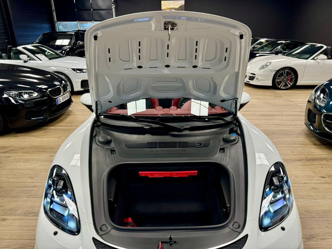 - equipements : capote bordeaux, capote manuelle, PDLS + sur fond noirs, covering Xpel intégral, Jantes noires 20, logo Porsche coloré sur les moyeux de roues centraux, cuir étendu sur le tableau de bord, sièges 918 Carbone, étriers de freins rouges, aileron réglable, PASM, PSE, pack sport chrono, échappement noir sport à valves, feux arrières teintés, intérieur cuir alcantara, carnet 100% Porsche à jour, Véhicule non accidenté, état proche du neuf, éligible au Porsche Approved, garantie de 12 à 60 mois constructeur