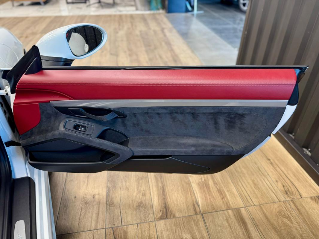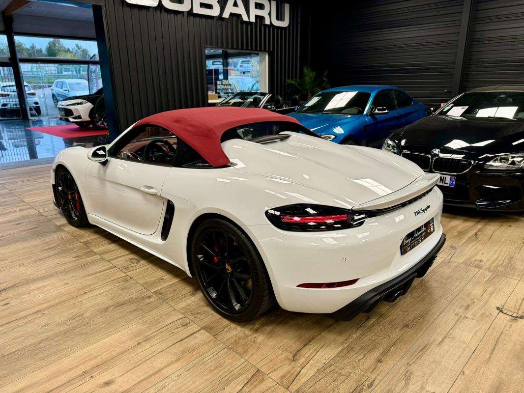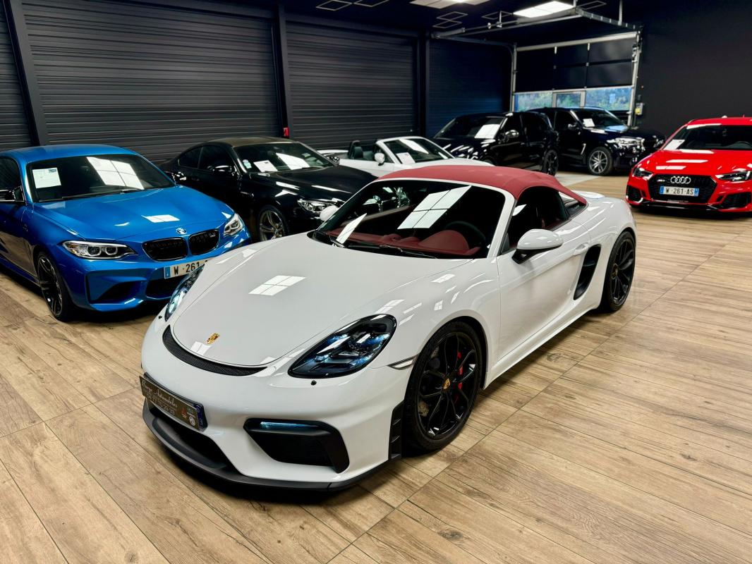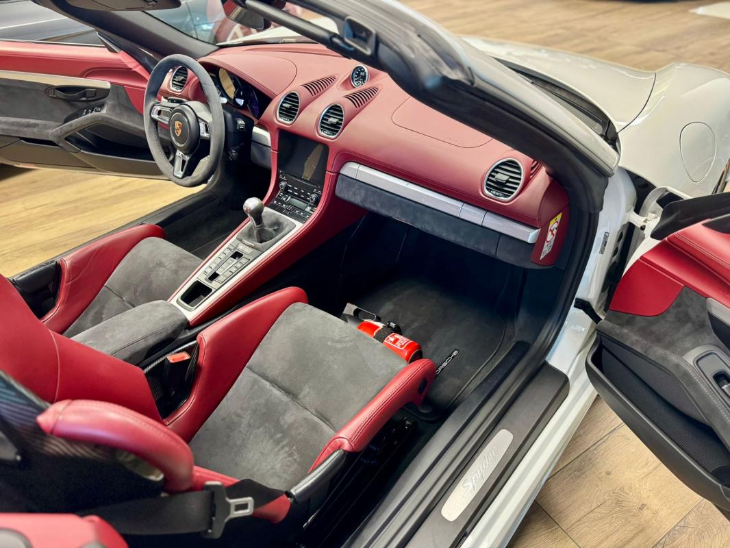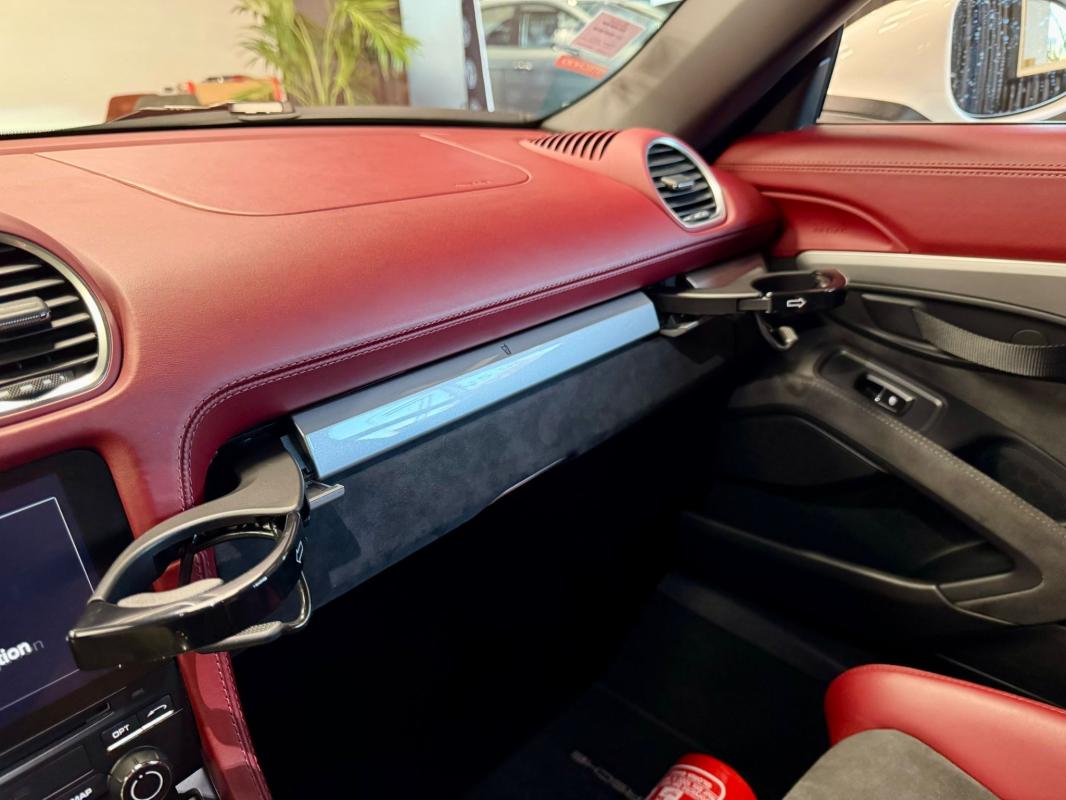 - equipements : capote bordeaux, capote manuelle, PDLS + sur fond noirs, covering Xpel intégral, Jantes noires 20, logo Porsche coloré sur les moyeux de roues centraux, cuir étendu sur le tableau de bord, sièges 918 Carbone, étriers de freins rouges, aileron réglable, PASM, PSE, pack sport chrono, échappement noir sport à valves, feux arrières teintés, intérieur cuir alcantara, carnet 100% Porsche à jour, Véhicule non accidenté, état proche du neuf, éligible au Porsche Approved, garantie de 12 à 60 mois constructeur